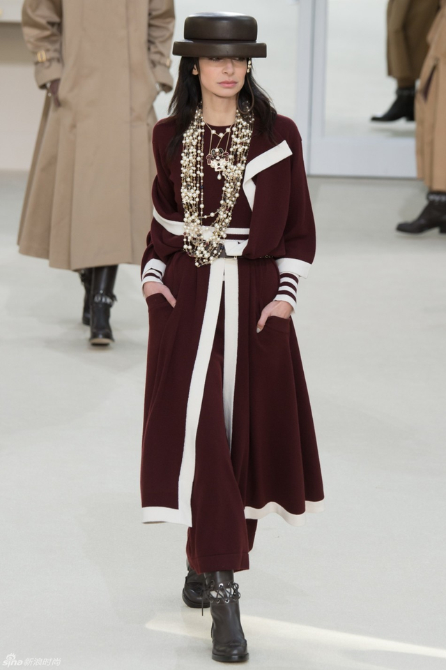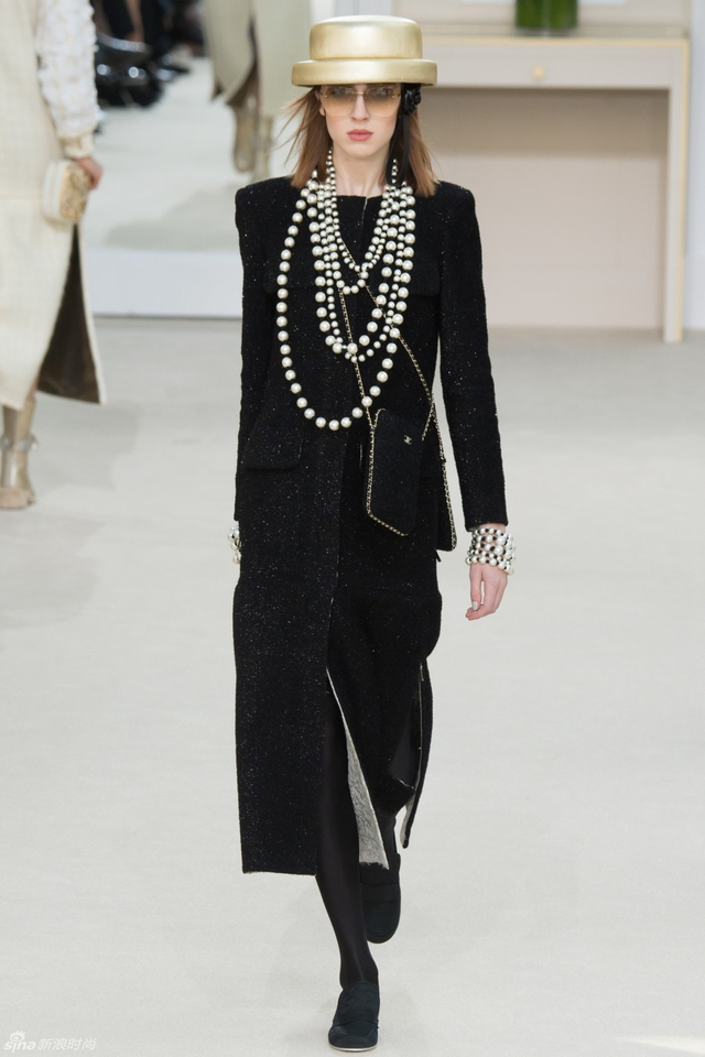 75/94 斜纹软呢的休闲夹克搭配圆顶的礼帽,Chanel小姐的形象勾勒出了一个年轻的形象。经典的格纹和折线纹装饰,让套装散发出了古典的味道,装饰性极强的珍珠项链,Chanel女士挚爱的单品到了新世纪也不乏时尚感。