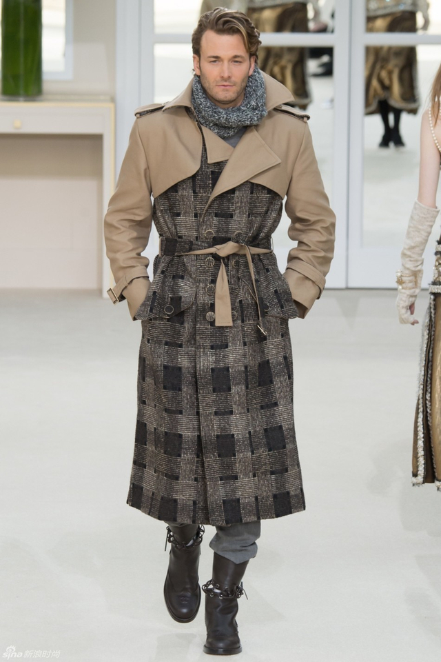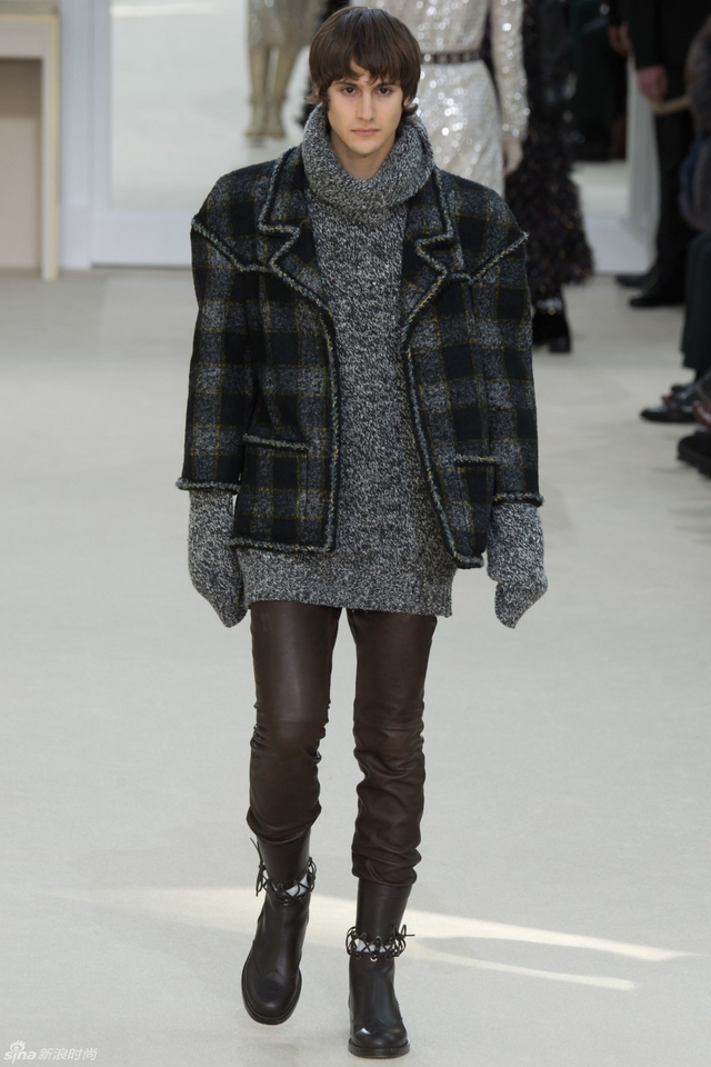 58/94 斜纹软呢的休闲夹克搭配圆顶的礼帽,Chanel小姐的形象勾勒出了一个年轻的形象。经典的格纹和折线纹装饰,让套装散发出了古典的味道,装饰性极强的珍珠项链,Chanel女士挚爱的单品到了新世纪也不乏时尚感。