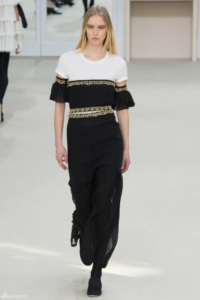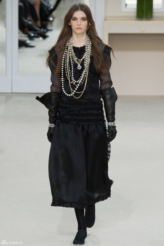 19/94 斜纹软呢的休闲夹克搭配圆顶的礼帽,Chanel小姐的形象勾勒出了一个年轻的形象。经典的格纹和折线纹装饰,让套装散发出了古典的味道,装饰性极强的珍珠项链,Chanel女士挚爱的单品到了新世纪也不乏时尚感。