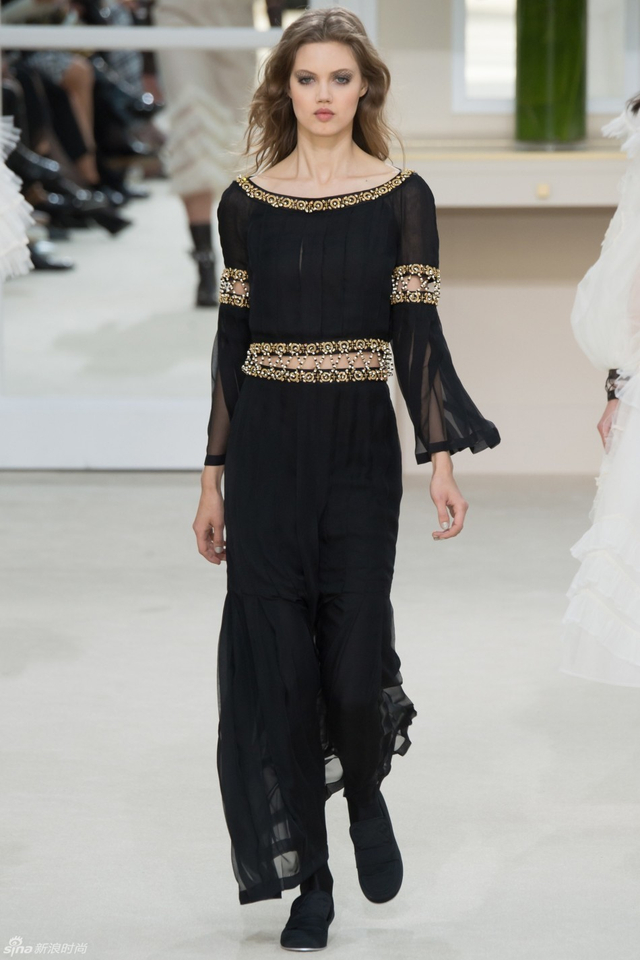 33/94 斜纹软呢的休闲夹克搭配圆顶的礼帽,Chanel小姐的形象勾勒出了一个年轻的形象。经典的格纹和折线纹装饰,让套装散发出了古典的味道,装饰性极强的珍珠项链,Chanel女士挚爱的单品到了新世纪也不乏时尚感。