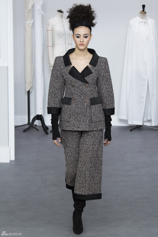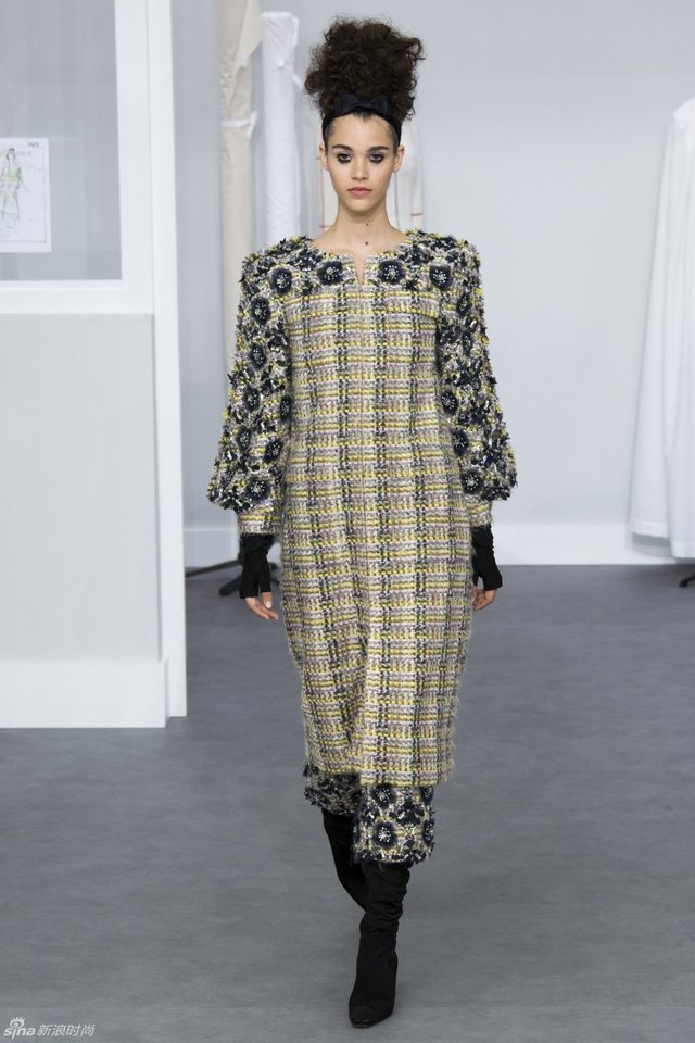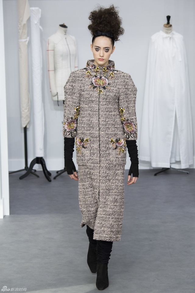 16/72 Chanel高级定制与时装同样精彩的还有秀场布置,本季老佛爷Karl Lagerfeld将高级定制的制作工坊搬上了秀场,一边是模特们鱼贯而出,一边是工匠手里未完成的刺绣和串珠,如此穿越的流程,见证了Chanel高级定制的强势地位。