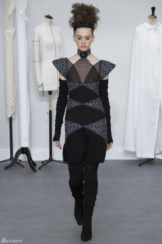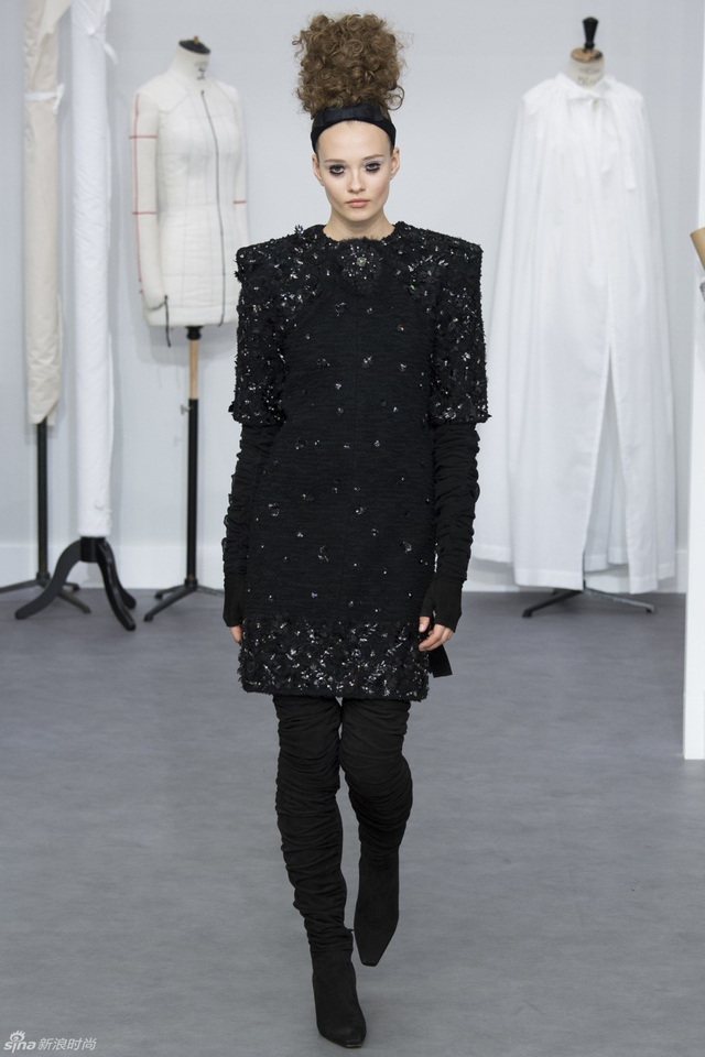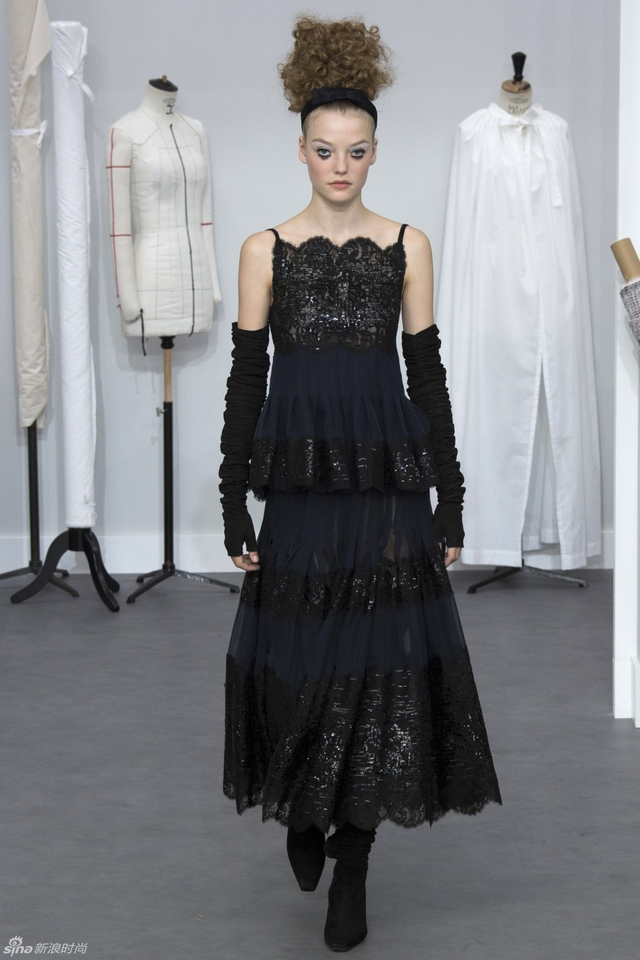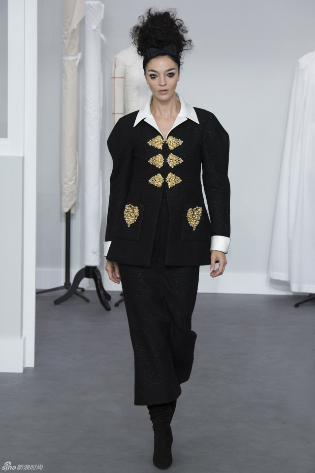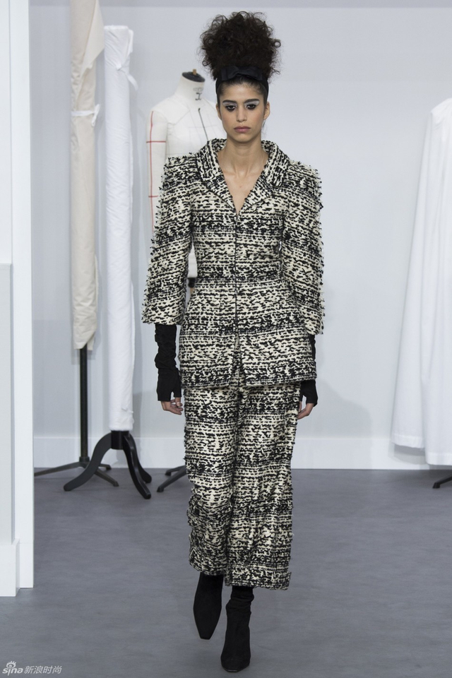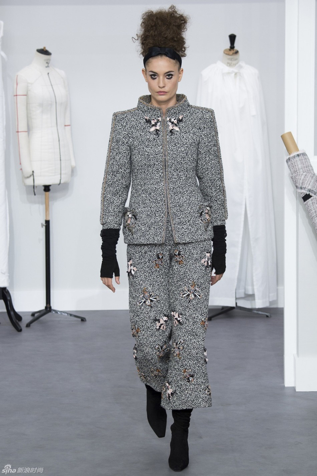 34/72 Chanel高级定制与时装同样精彩的还有秀场布置,本季老佛爷Karl Lagerfeld将高级定制的制作工坊搬上了秀场,一边是模特们鱼贯而出,一边是工匠手里未完成的刺绣和串珠,如此穿越的流程,见证了Chanel高级定制的强势地位。