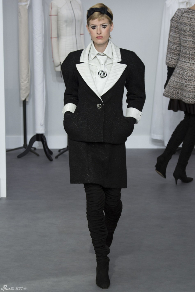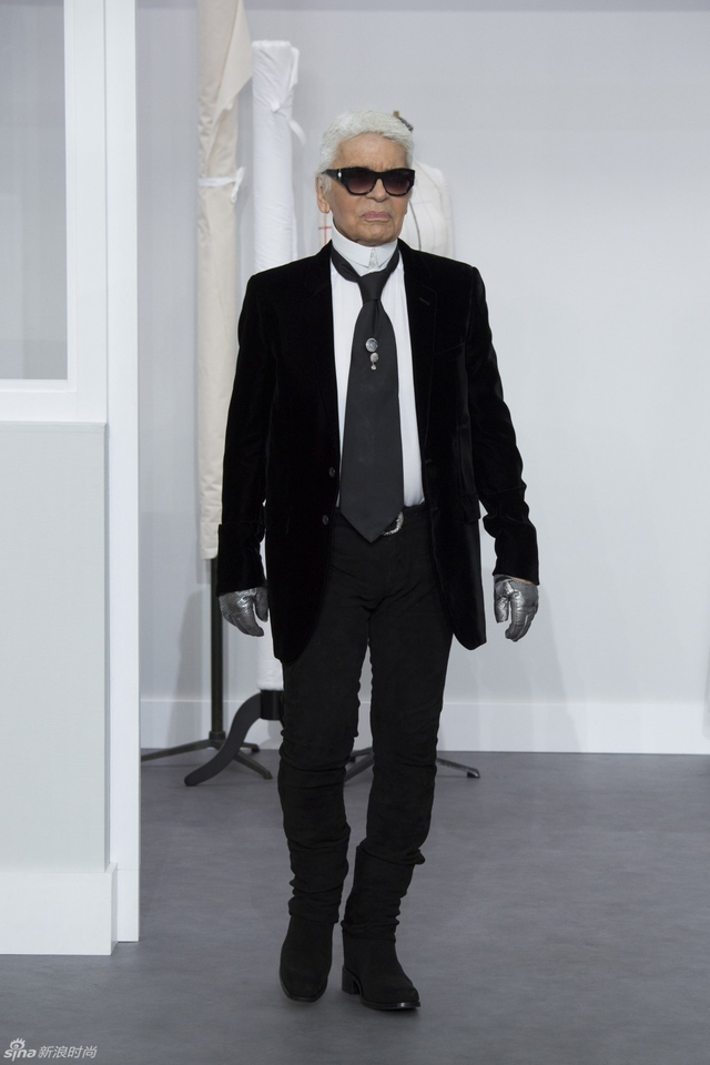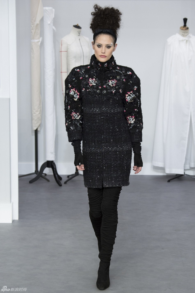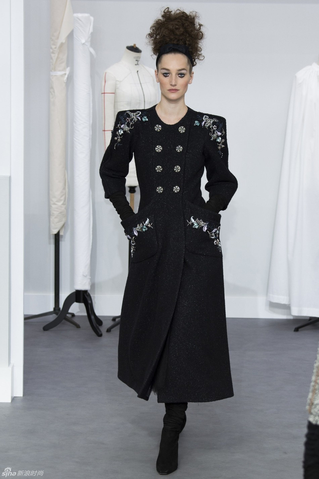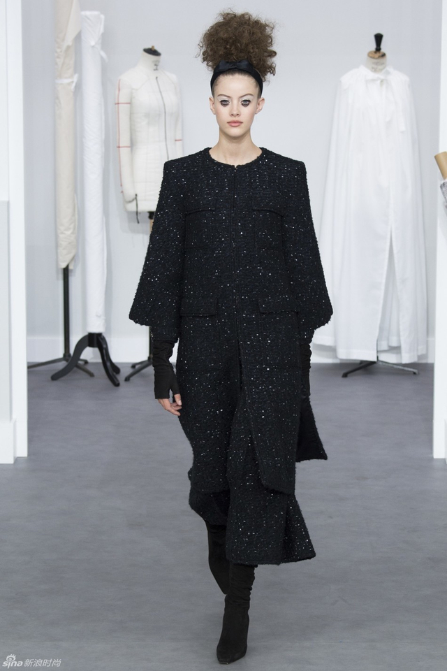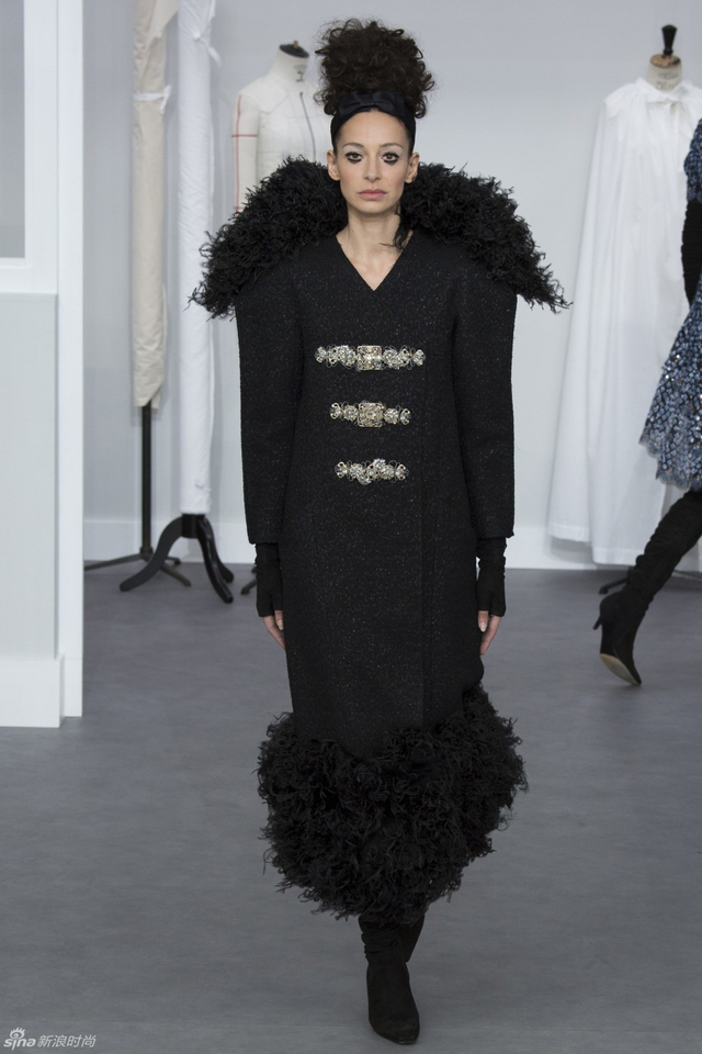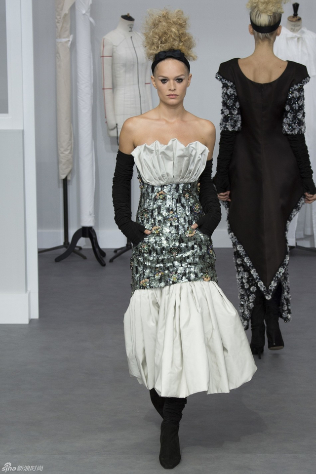 72/72 Chanel高级定制与时装同样精彩的还有秀场布置,本季老佛爷Karl Lagerfeld将高级定制的制作工坊搬上了秀场,一边是模特们鱼贯而出,一边是工匠手里未完成的刺绣和串珠,如此穿越的流程,见证了Chanel高级定制的强势地位。