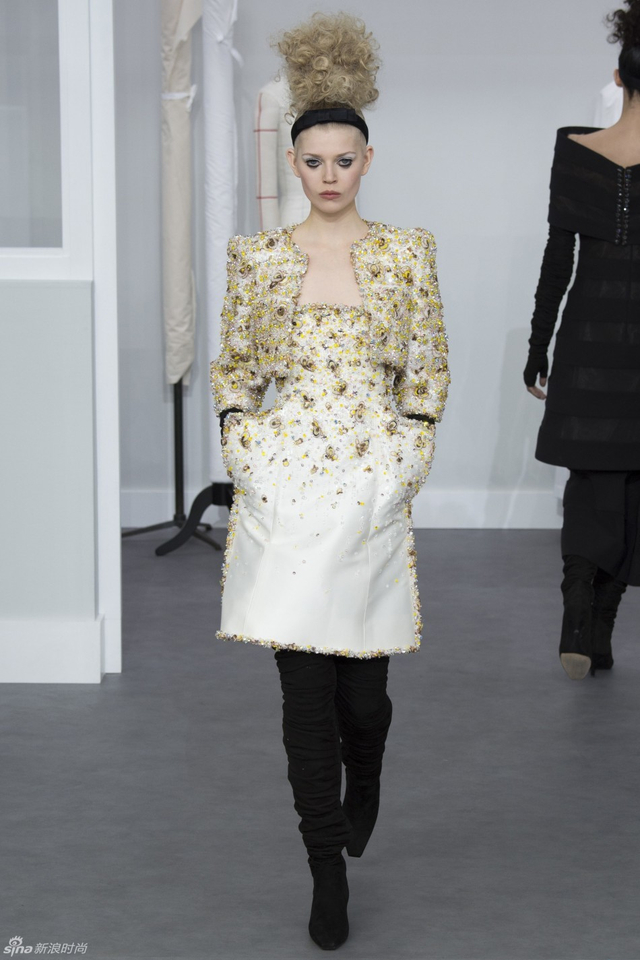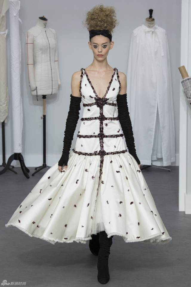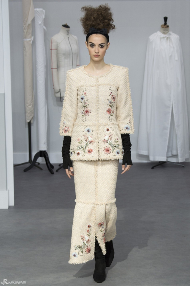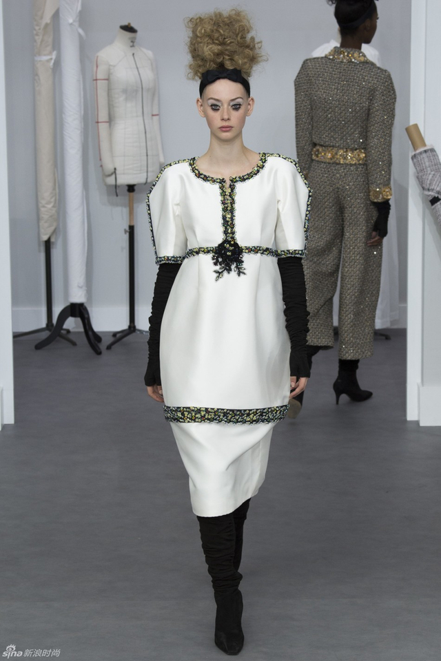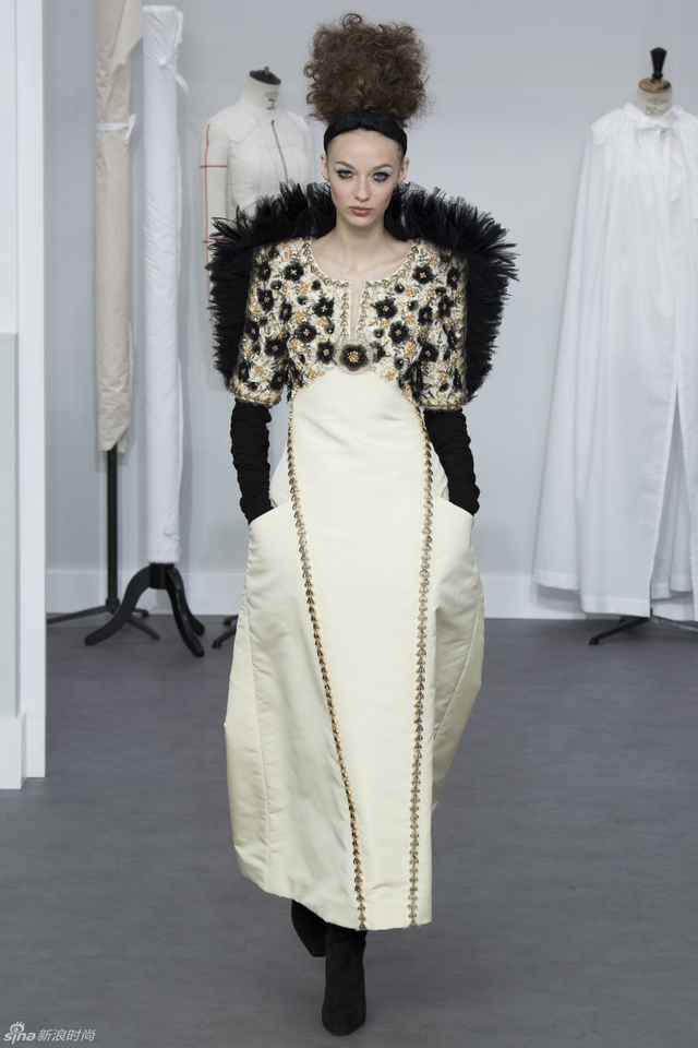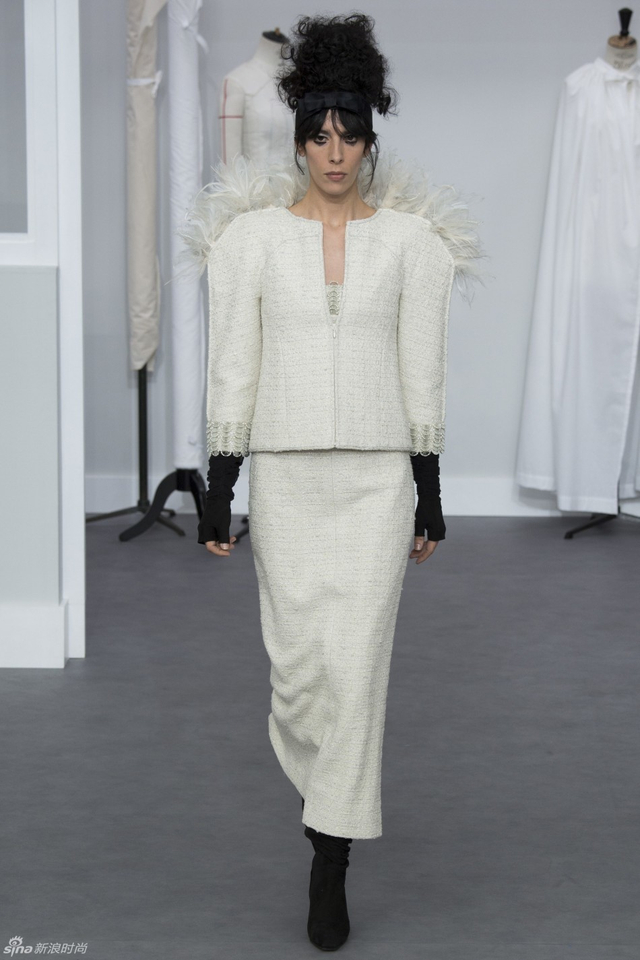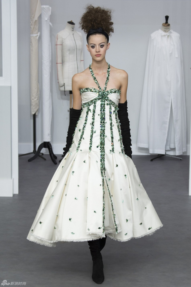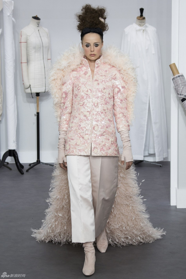 2/72 Chanel高级定制与时装同样精彩的还有秀场布置,本季老佛爷Karl Lagerfeld将高级定制的制作工坊搬上了秀场,一边是模特们鱼贯而出,一边是工匠手里未完成的刺绣和串珠,如此穿越的流程,见证了Chanel高级定制的强势地位。
