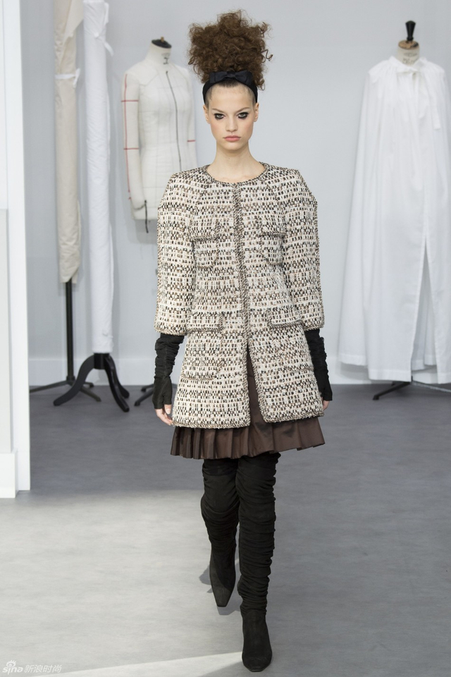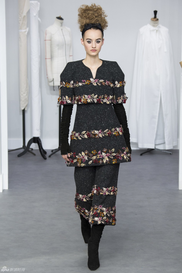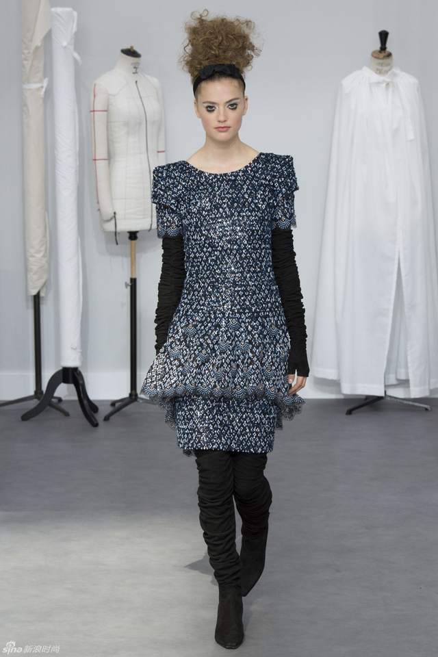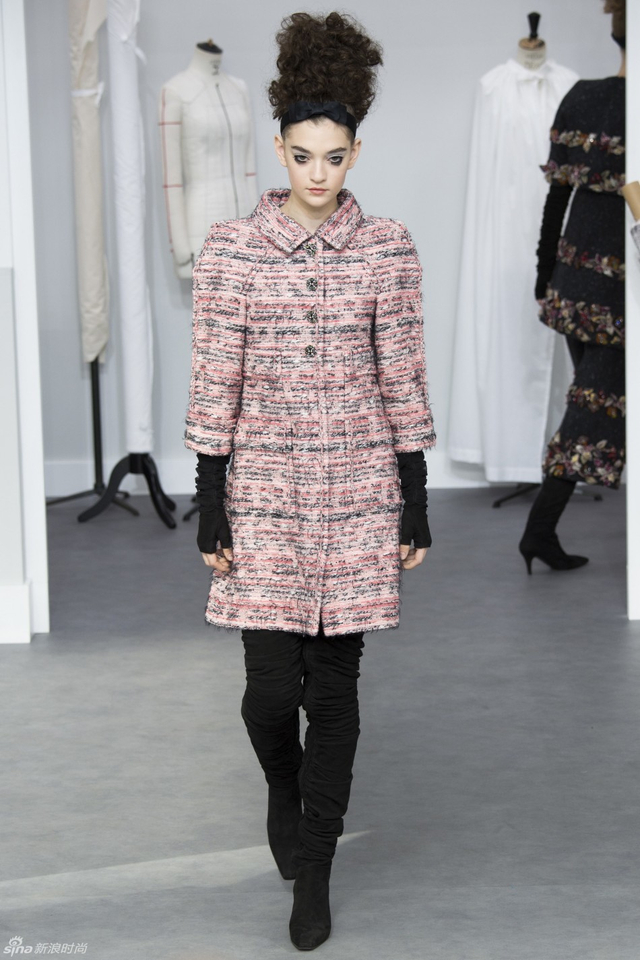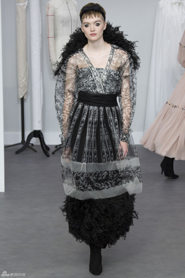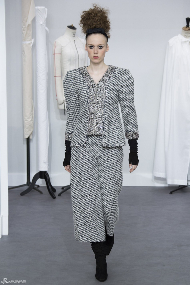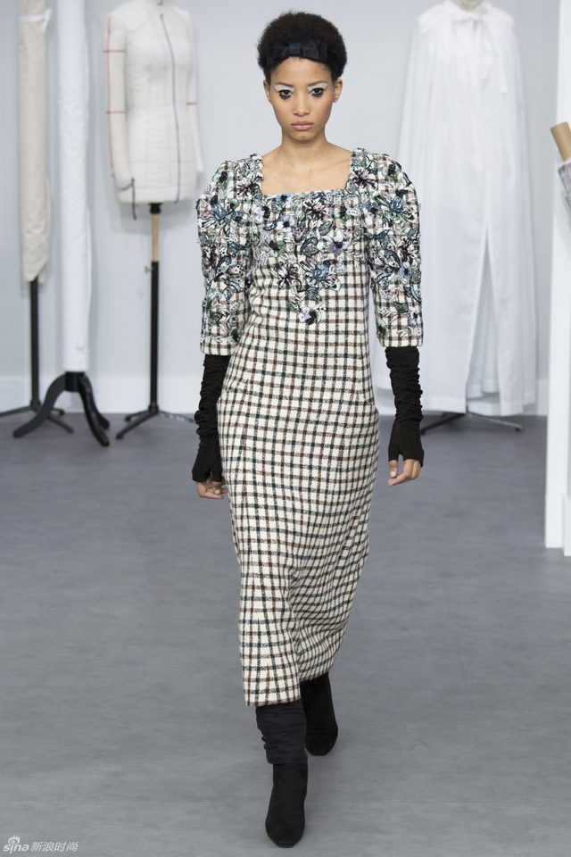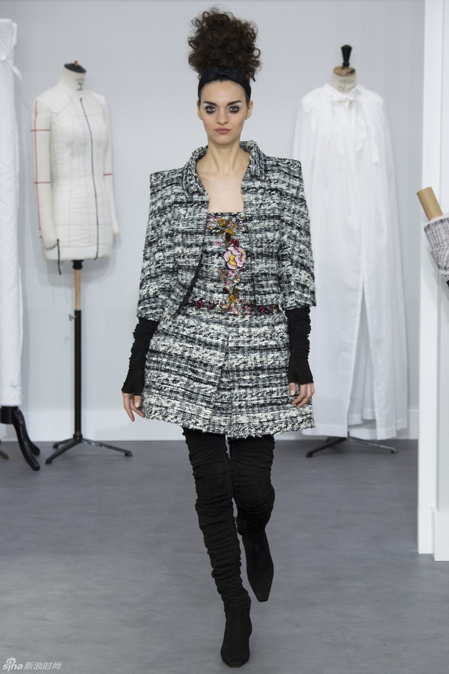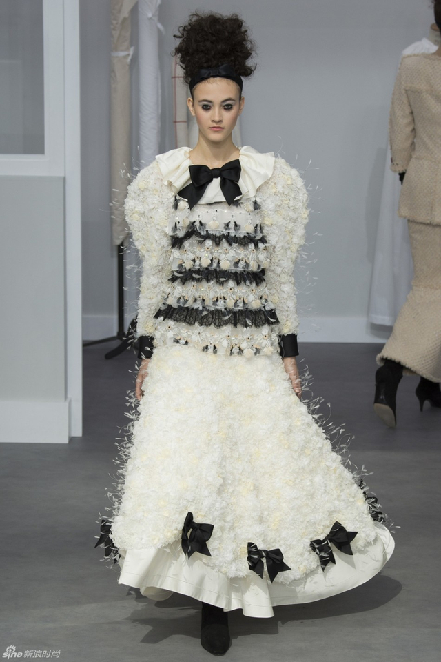 2/72 Chanel高级定制与时装同样精彩的还有秀场布置,本季老佛爷Karl Lagerfeld将高级定制的制作工坊搬上了秀场,一边是模特们鱼贯而出,一边是工匠手里未完成的刺绣和串珠,如此穿越的流程,见证了Chanel高级定制的强势地位。