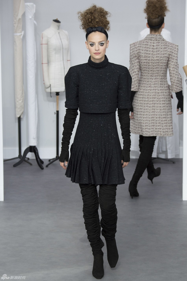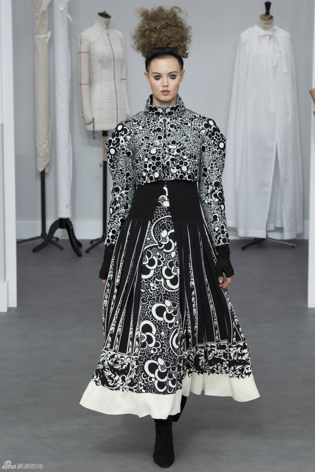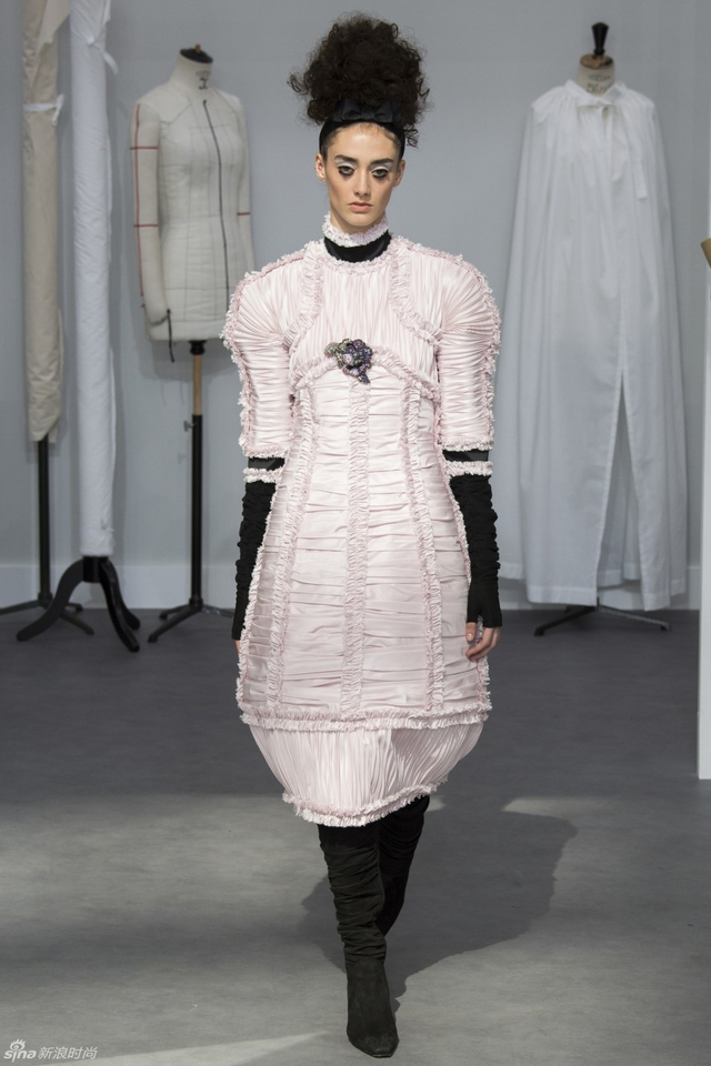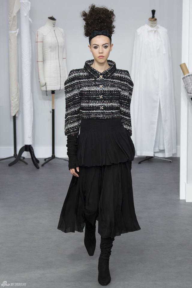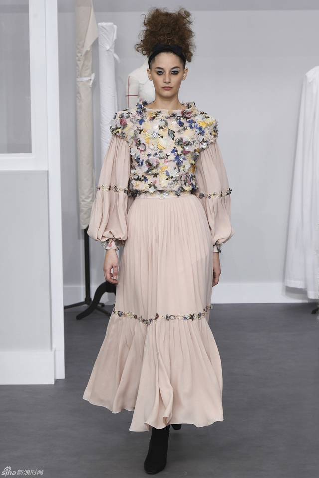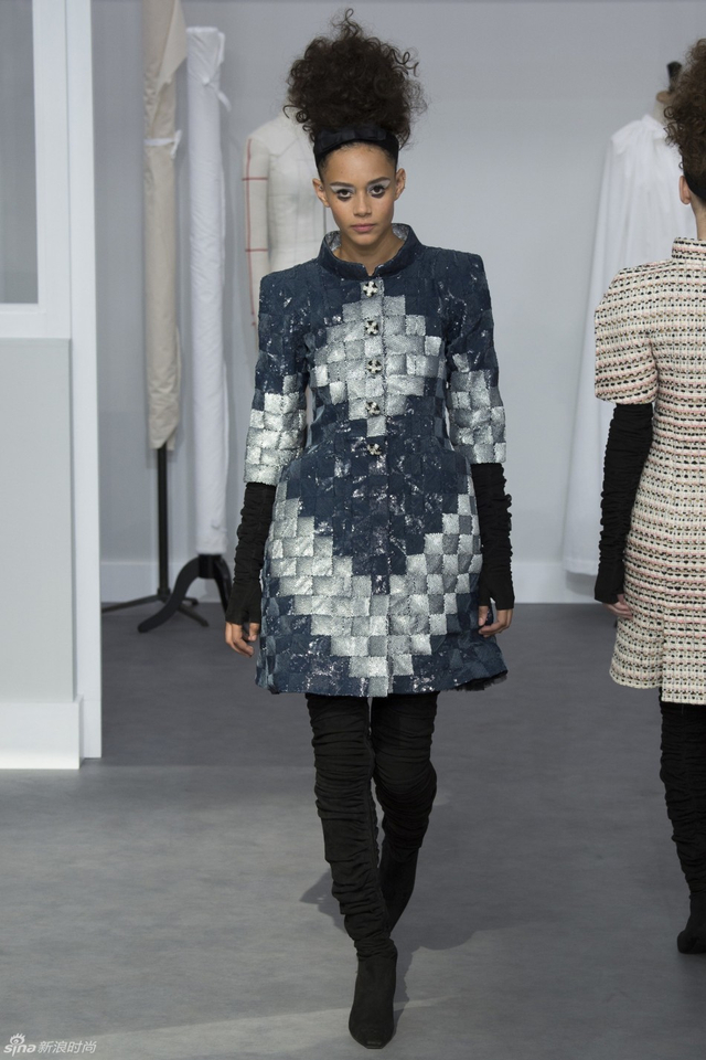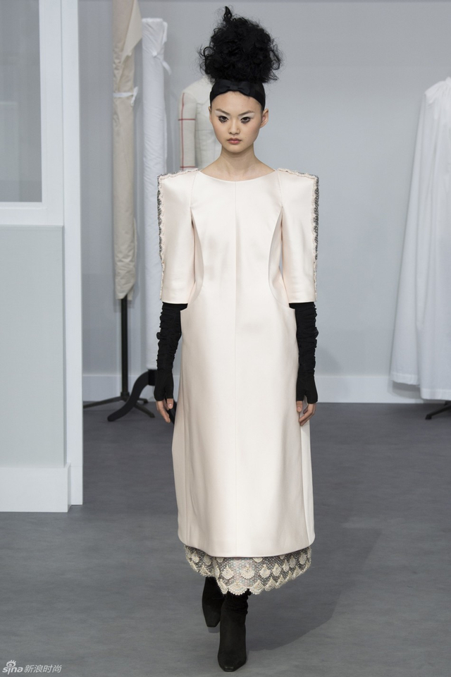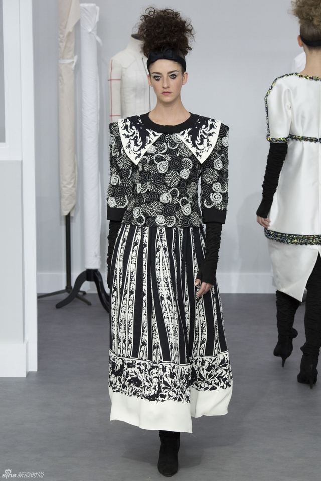2/72 Chanel高级定制与时装同样精彩的还有秀场布置,本季老佛爷Karl Lagerfeld将高级定制的制作工坊搬上了秀场,一边是模特们鱼贯而出,一边是工匠手里未完成的刺绣和串珠,如此穿越的流程,见证了Chanel高级定制的强势地位。