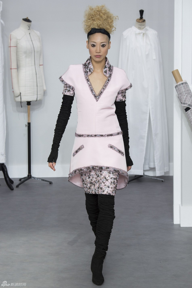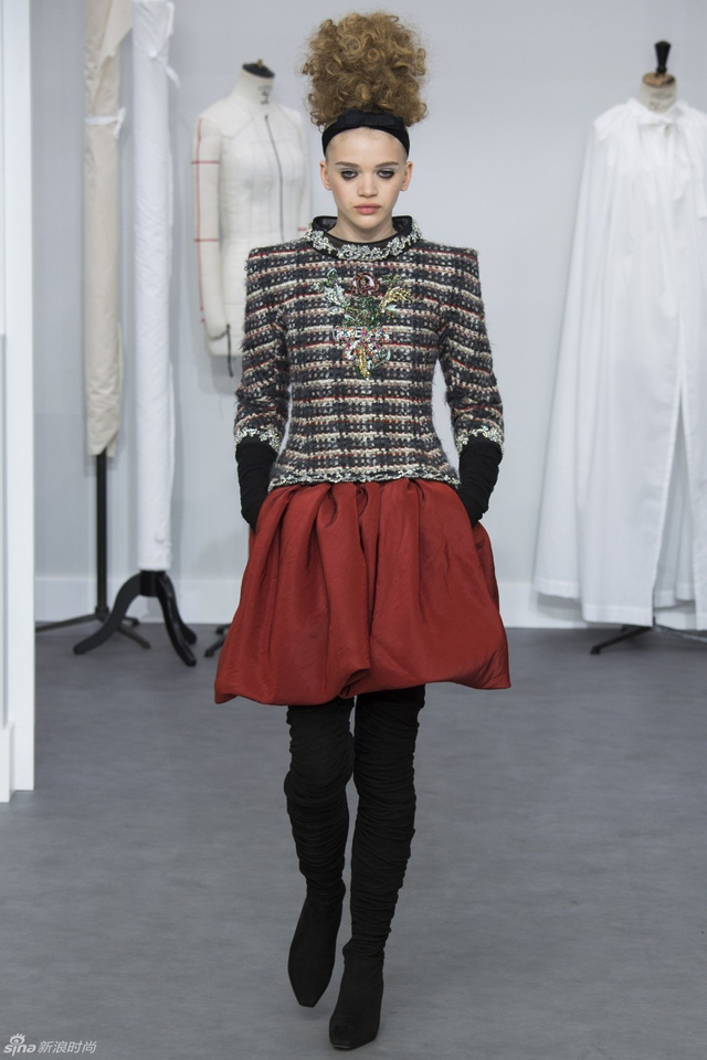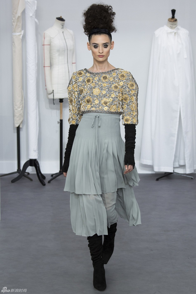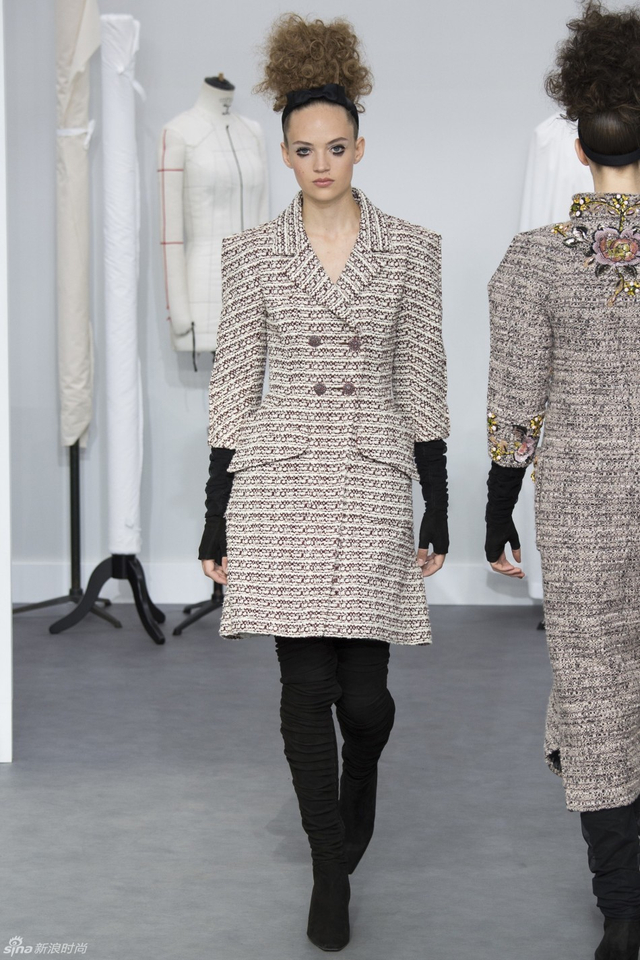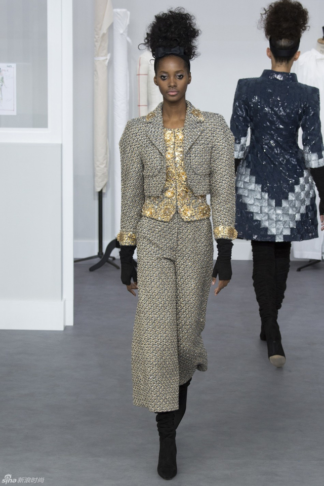 51/72 Chanel高级定制与时装同样精彩的还有秀场布置,本季老佛爷Karl Lagerfeld将高级定制的制作工坊搬上了秀场,一边是模特们鱼贯而出,一边是工匠手里未完成的刺绣和串珠,如此穿越的流程,见证了Chanel高级定制的强势地位。