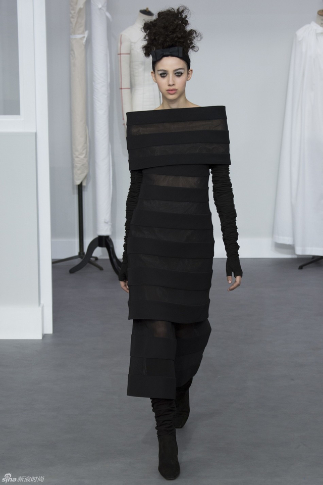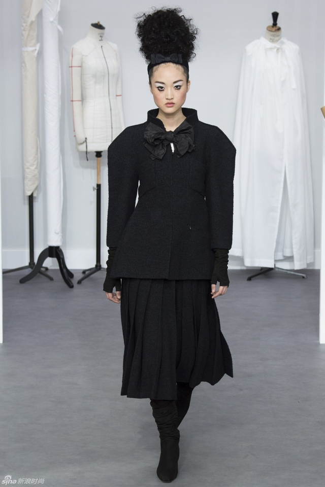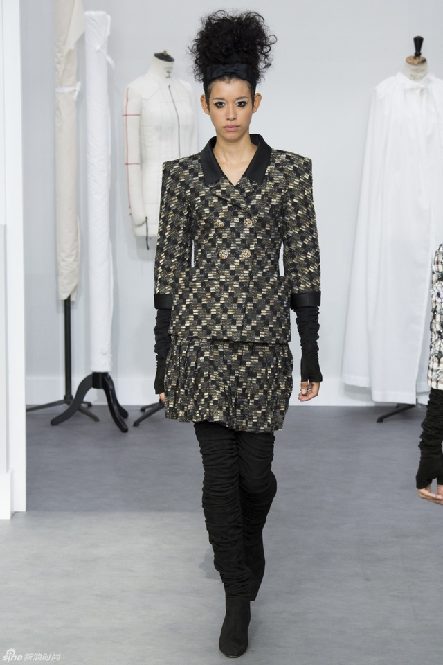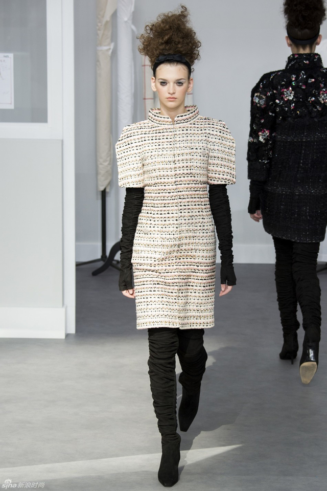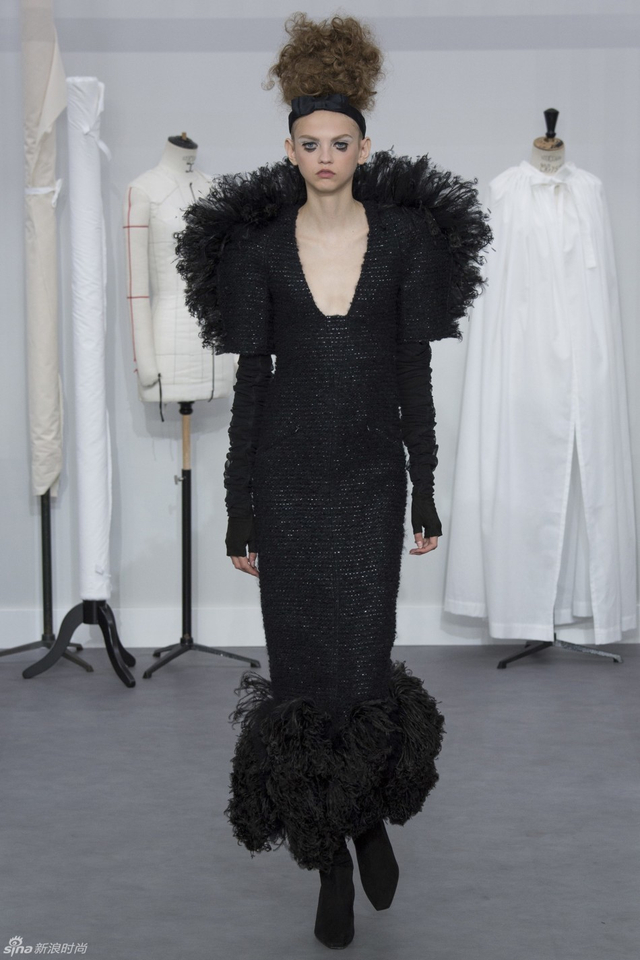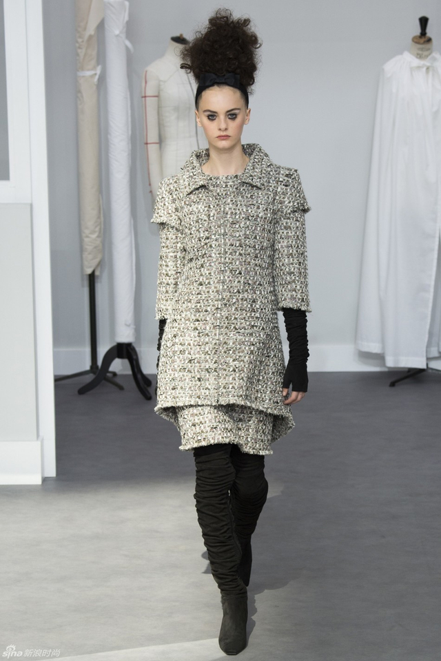 14/72 Chanel高级定制与时装同样精彩的还有秀场布置,本季老佛爷Karl Lagerfeld将高级定制的制作工坊搬上了秀场,一边是模特们鱼贯而出,一边是工匠手里未完成的刺绣和串珠,如此穿越的流程,见证了Chanel高级定制的强势地位。