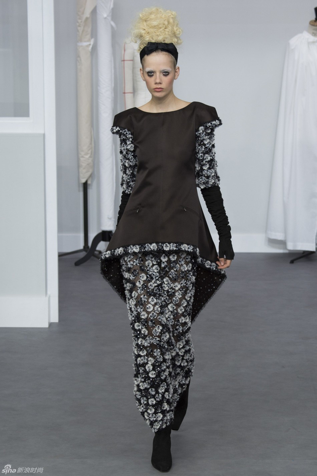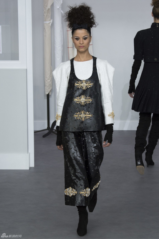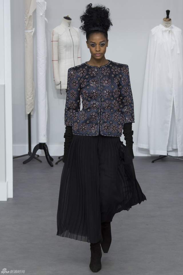 38/72 Chanel高级定制与时装同样精彩的还有秀场布置,本季老佛爷Karl Lagerfeld将高级定制的制作工坊搬上了秀场,一边是模特们鱼贯而出,一边是工匠手里未完成的刺绣和串珠,如此穿越的流程,见证了Chanel高级定制的强势地位。