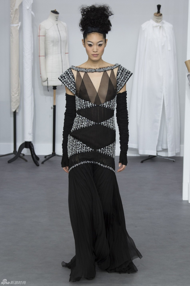 33/72 Chanel高级定制与时装同样精彩的还有秀场布置,本季老佛爷Karl Lagerfeld将高级定制的制作工坊搬上了秀场,一边是模特们鱼贯而出,一边是工匠手里未完成的刺绣和串珠,如此穿越的流程,见证了Chanel高级定制的强势地位。