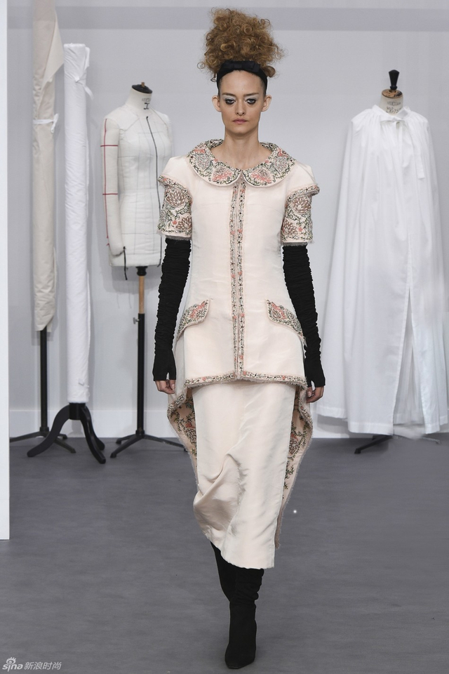 58/72 Chanel高级定制与时装同样精彩的还有秀场布置,本季老佛爷Karl Lagerfeld将高级定制的制作工坊搬上了秀场,一边是模特们鱼贯而出,一边是工匠手里未完成的刺绣和串珠,如此穿越的流程,见证了Chanel高级定制的强势地位。