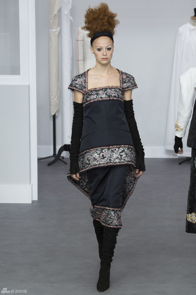 45/72 Chanel高级定制与时装同样精彩的还有秀场布置,本季老佛爷Karl Lagerfeld将高级定制的制作工坊搬上了秀场,一边是模特们鱼贯而出,一边是工匠手里未完成的刺绣和串珠,如此穿越的流程,见证了Chanel高级定制的强势地位。
