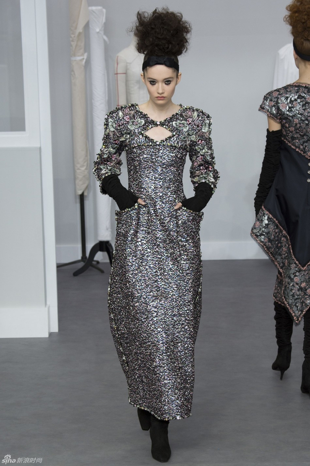 41/72 Chanel高级定制与时装同样精彩的还有秀场布置,本季老佛爷Karl Lagerfeld将高级定制的制作工坊搬上了秀场,一边是模特们鱼贯而出,一边是工匠手里未完成的刺绣和串珠,如此穿越的流程,见证了Chanel高级定制的强势地位。