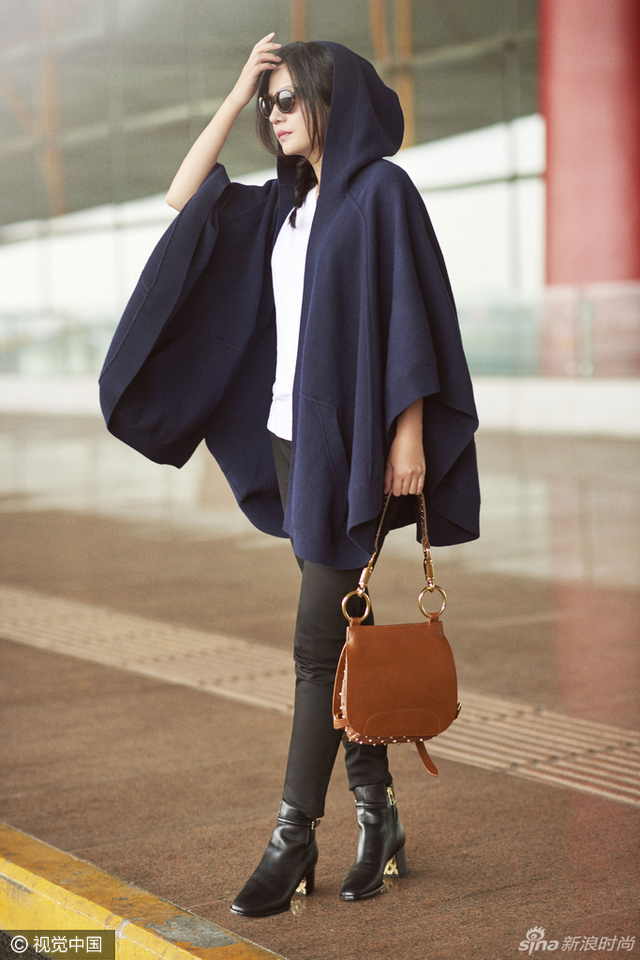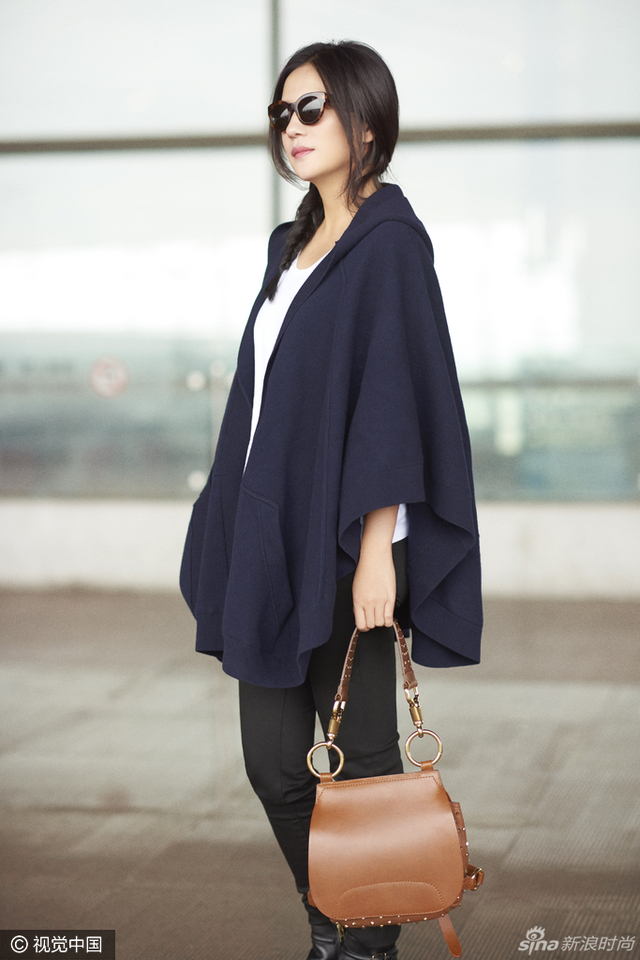 赵薇绑麻花辫启程伦敦时装周 斗篷配黑超气场强