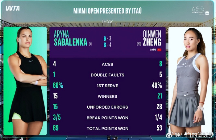 萨巴伦卡无愧世界第一,她已经第32次跻身WTA1000+赛事的八强,连续15项赛事至少闯入八强,赛季20胜1负(目前是一波9连胜),生涯在迈阿密站9连胜,她的统治力的确很强,但郑钦文这场比赛并不是一点机会也没有。