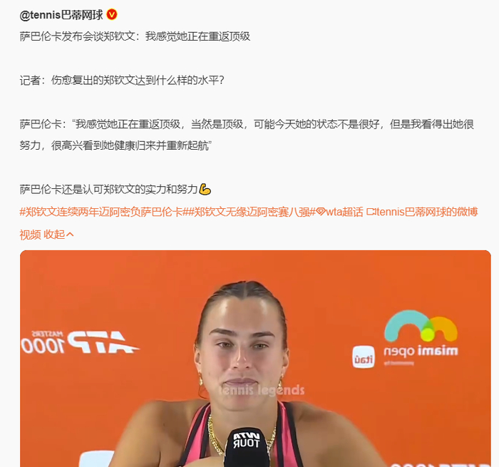 赛后萨巴伦卡谈到郑钦文的表现,她表示:感觉郑钦文正在重返顶级,当然是最顶级,可能她今天的状态不是太好,我看出她很努力,很高兴能看到她健康归来并且重新起航。