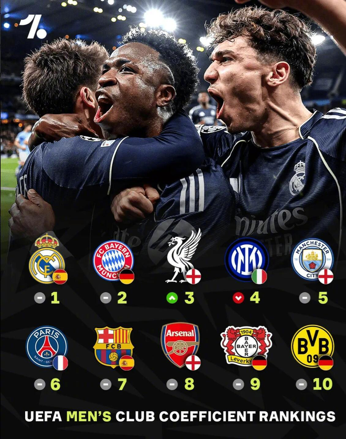 欧足联俱乐部系数排名最新一期显示,皇家马德里以144.5分排名欧洲第1,拜仁慕尼黑以141分位列第2,利物浦以130分排名第3。前十其余球队分别是国际米兰、曼城、巴黎圣日耳曼、巴塞罗那、阿森纳、勒沃库森和多特蒙德。