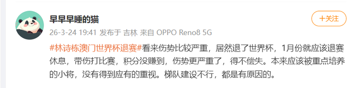 有球迷表示,林诗栋看起来伤势比较严重,1月份就该退赛休息的。带伤打比赛也没拿到积分,伤势还更严重了得不偿失。