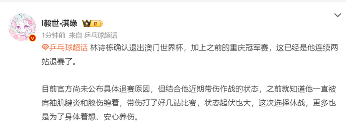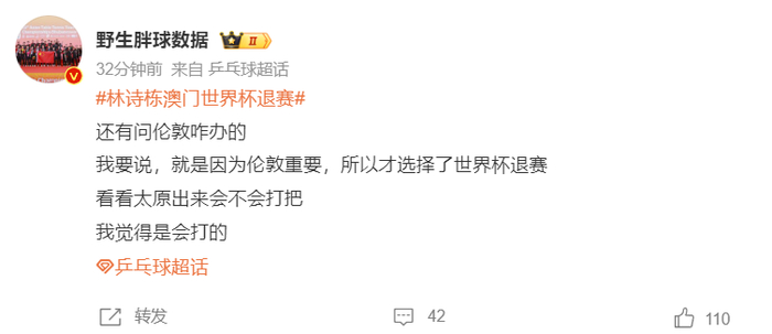 也有大V认为林诗栋退出澳门世界杯就是为了伦敦世乒赛,在他的伤势好一些的情况下他在WTT太原站是有可能复出的。