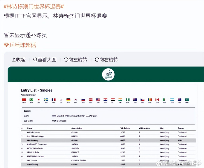 北京时间3月24日,根据ITTF官方显示,林诗栋退出2026年澳门世界杯,目前还没有显示递补的球员,澳门世界杯在3月30日就要打开,林诗栋在这个时候才被官宣退出说明他大概率是有伤。