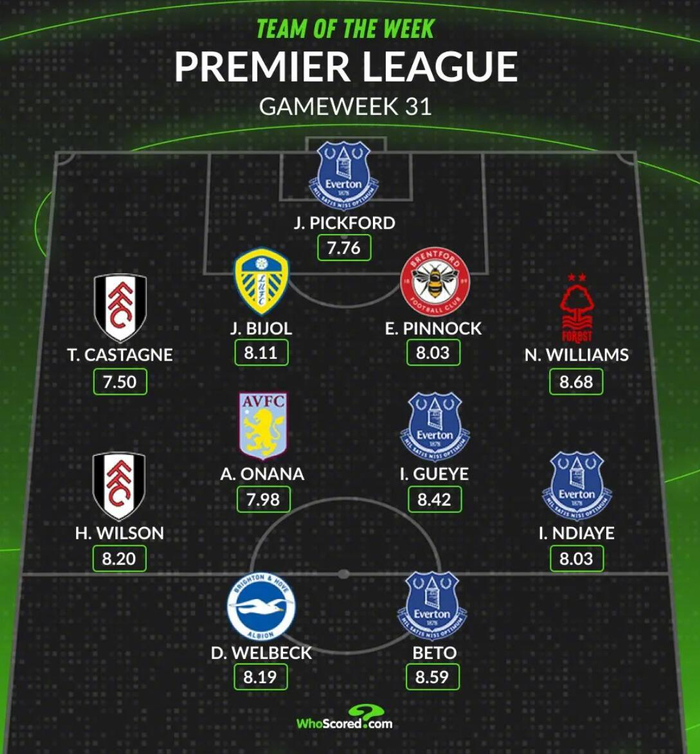 著名统计机构WhoScored公布了英超第31轮的最佳阵容,埃弗顿4人上榜,Big6无人入选。