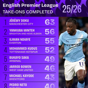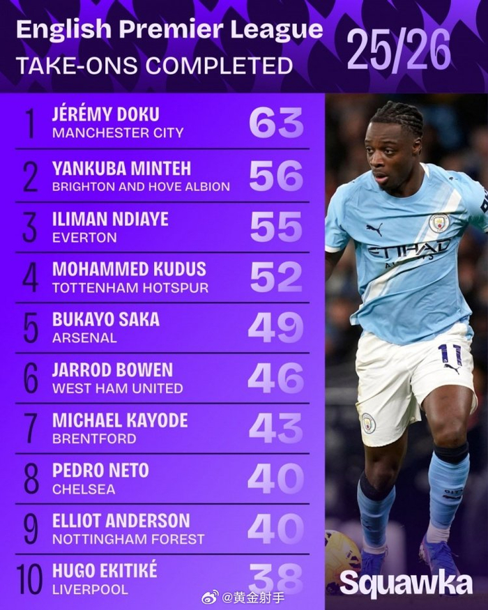 #曼城[超话]# 数据机构Squawka统计出了本赛季英超球员过人数情况,曼城边锋多库以63次居首。