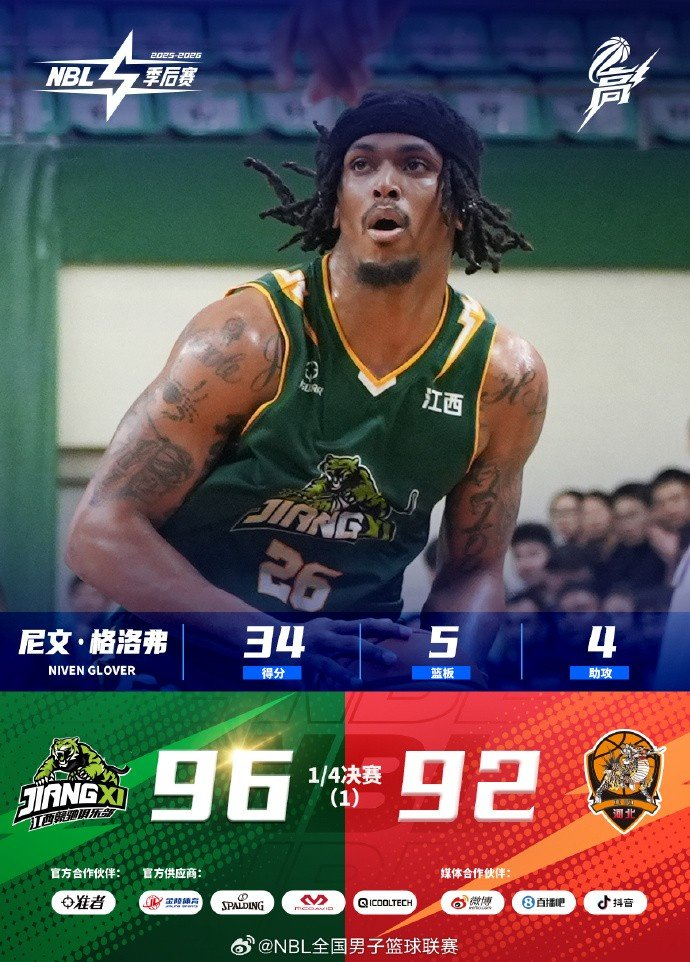 本场季后赛 1/4 决赛首战,双方开局胶着,江西鲸裕清酒次节进攻熄火陷入低迷,上半场落于被动;易边再战, 26 号尼文-格洛弗彻底爆发,单节狂砍主导进攻,带领球队掀起反扑狂澜,一举扭转场上局势;末节决战,江西鲸裕清酒全队稳扎稳打,牢牢把控胜局,最终以96-92主场取胜。