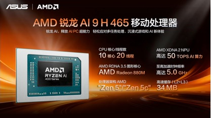 随后,AMD大中华区家用产品市场总监 廖金宁 讲解了华硕全系新品搭载的全新AMD锐龙AI平台,包括锐龙AI Max+系列以及AI 400系列的性能优势。其中,AMD锐龙AI Max+ 395处理器提供工作站级的创意性能、沉浸式3A游戏体验以及便携的AI工作站属性;AMD锐龙AI 9 H 465处理器,带来“Zen 5”/“Zen 5c”全新CPU架构与至高50 TOPS NPU AI算力,释放AI PC超能力,并以高能效比表现带来领先的AI性能体验。