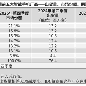 整体而言,2025年,中国智能手机市场出货量约2.85亿台,同比下降0.6%。其中华为出货量为4670万台,同比下跌1.9%,位列第一;苹果、vivo、小米、OPPO分别位列第二-第五位,荣耀跌出TOP 5榜单。