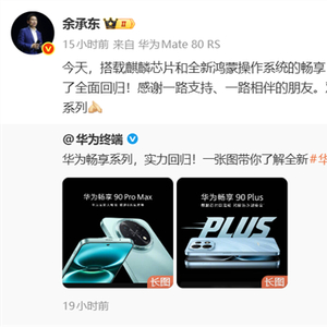 3月23日,余承东通过微博掷地有声地官宣:“搭载麒麟芯片和全新鸿蒙操作系统的畅享90系列发布,华为手机终于实现了全面回归!感谢一路支持、一路相伴的朋友。”