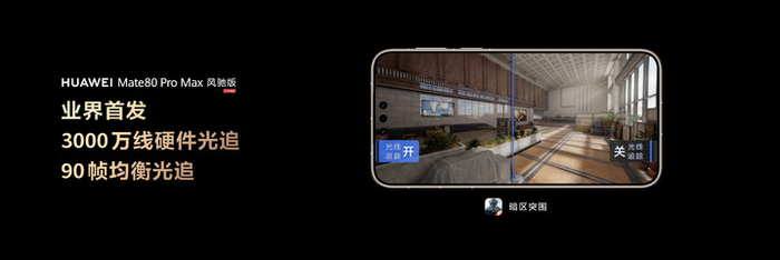 有了主动散热作为基础,Mate 80 Pro Max 风驰版的光线追踪硬加速表现也实现了升级,在鸿蒙版《暗区突围》中,最高支持实时渲染的光线数提升至 3000 万线——
